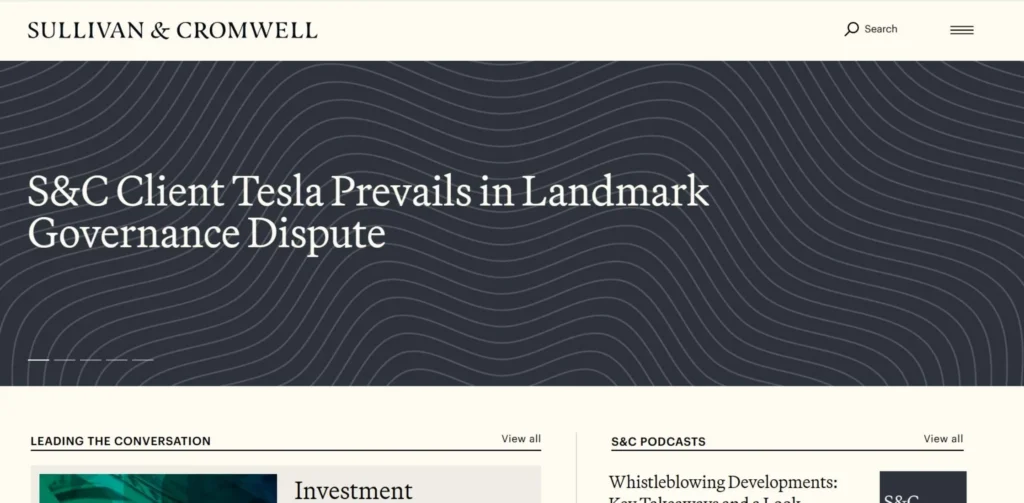 | Sullivan & Cromwell | Corporate, Litigation | 13 offices globally | sullcrom.com |